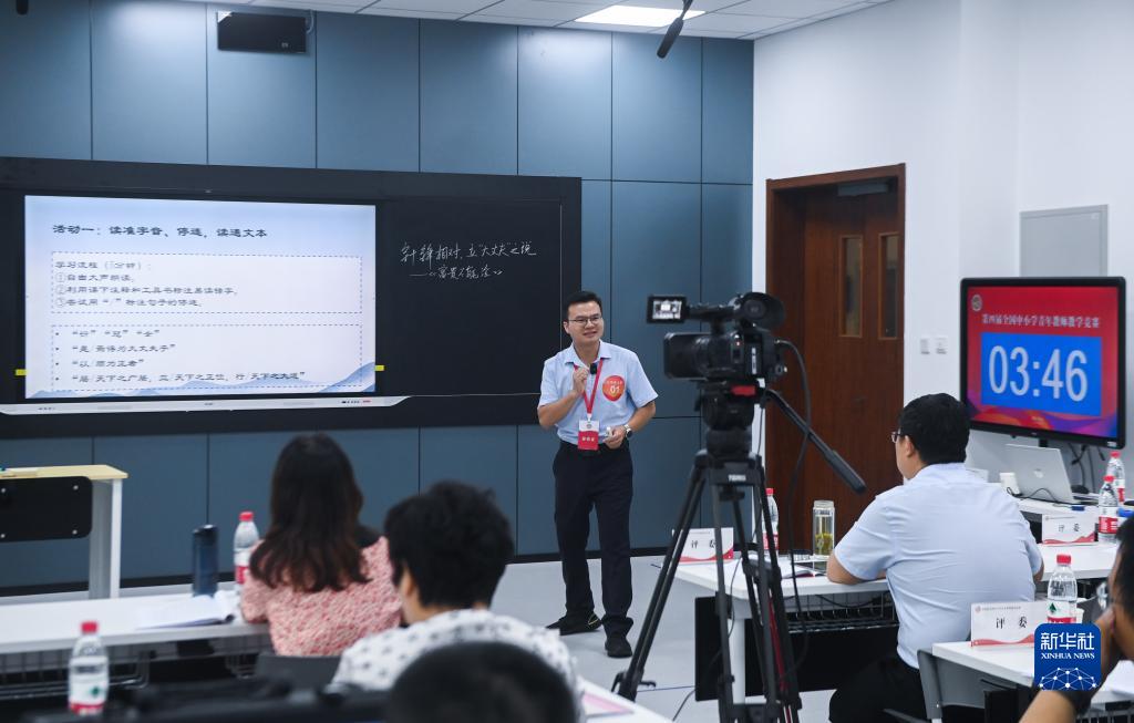 8月22日,中學(xué)語(yǔ)文組的一名教師在進(jìn)行教學(xué)展示。