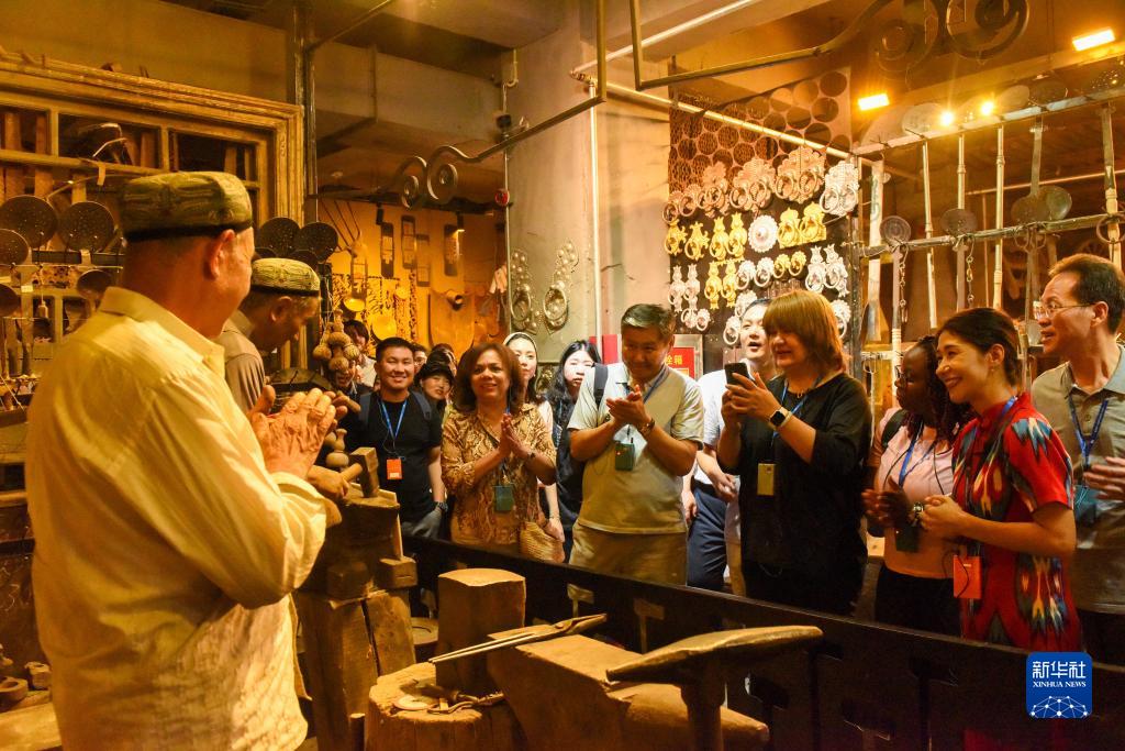參訪(fǎng)團成員參觀(guān)新疆喀什古城,點(diǎn)贊手工藝人高超技藝(8月17日攝)。