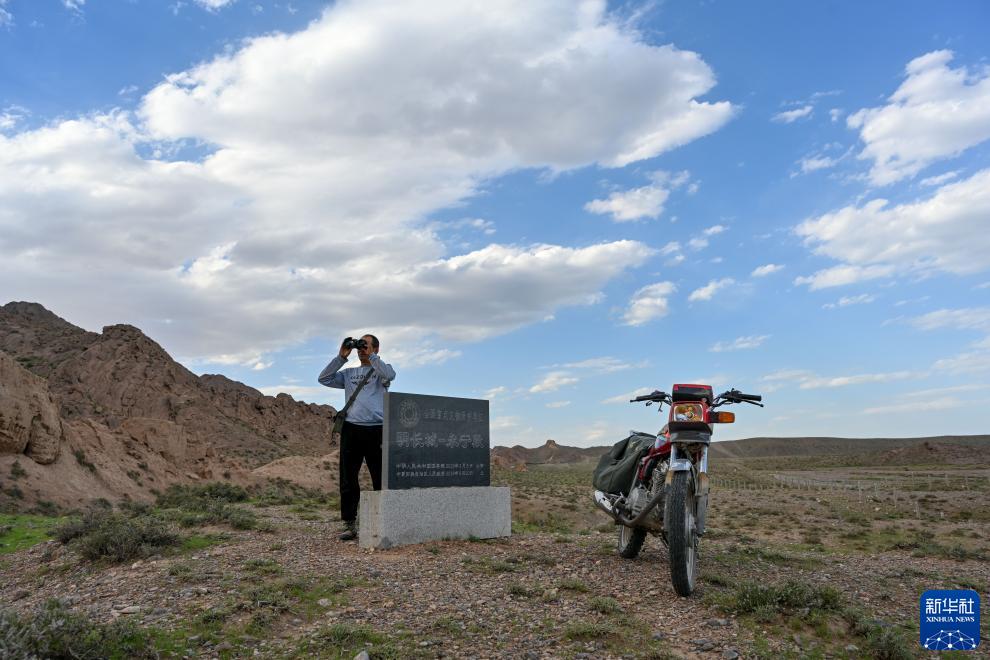 8月20日,董海寧騎摩托車(chē)巡查賀蘭山沿線(xiàn)的明長(cháng)城永寧段,利用望遠鏡觀(guān)察遠處長(cháng)城情況。