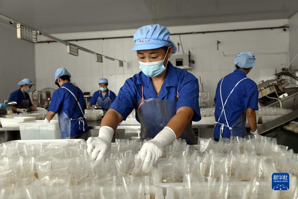 8月22日,在山東省濱州市沾化區馮家鎮隆旺水產(chǎn)的加工車(chē)間內,工人們對海蜇進(jìn)行標準稱(chēng)重。