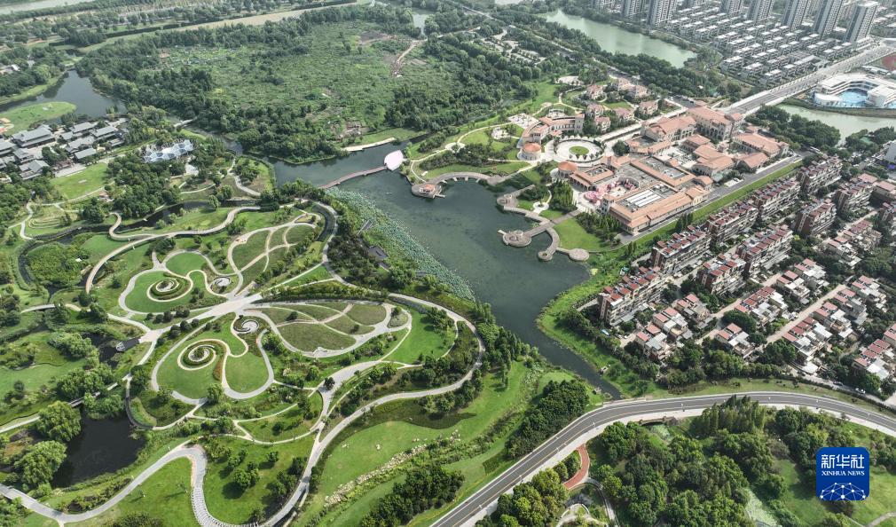 位于八里店鎮的西山漾國家城市濕地公園和周邊的居民區相互融合(無(wú)人機照片,8月23日攝)。