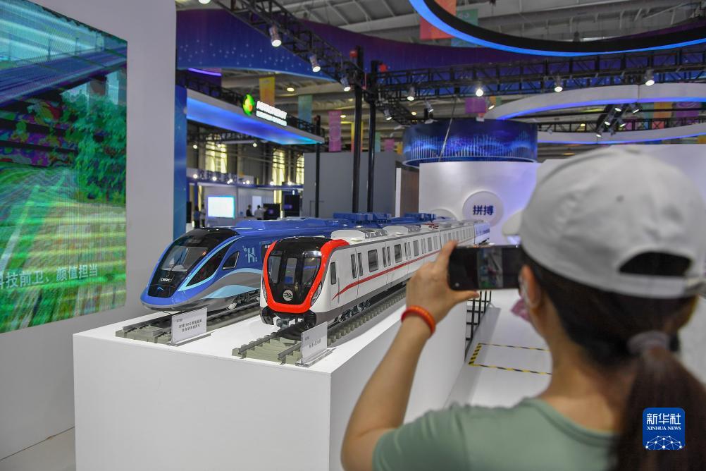 8月23日,在第十四屆中國—東北亞博覽會(huì )現場(chǎng),參觀(guān)者拍攝中國中車(chē)展出的列車(chē)模型。