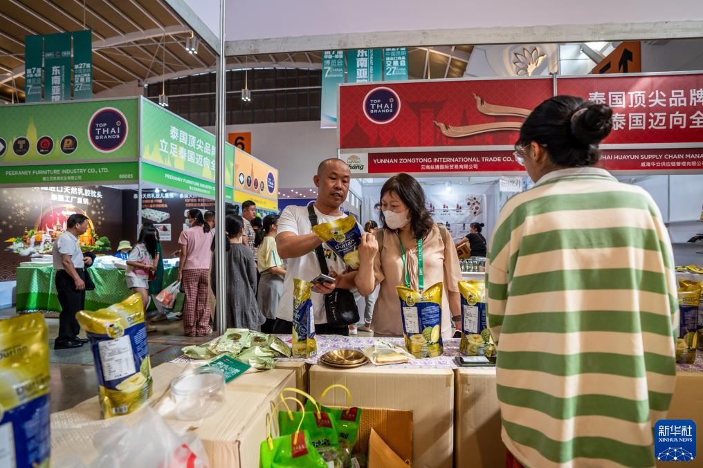 8月17日,泰國華商陳杰(右三)在南博會(huì )上銷(xiāo)售榴蓮干。新華社記者 胡超 攝