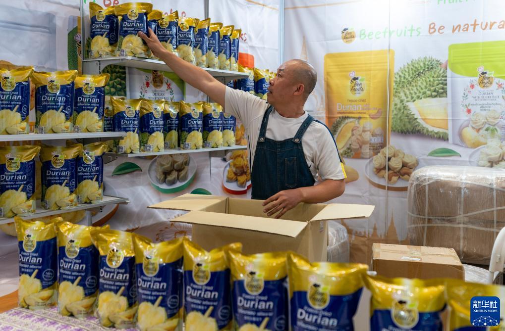 陳杰在昆明滇池國際會(huì )展中心自己的展位上擺放榴蓮干(8月14日攝)。新華社記者 陳欣波 攝
