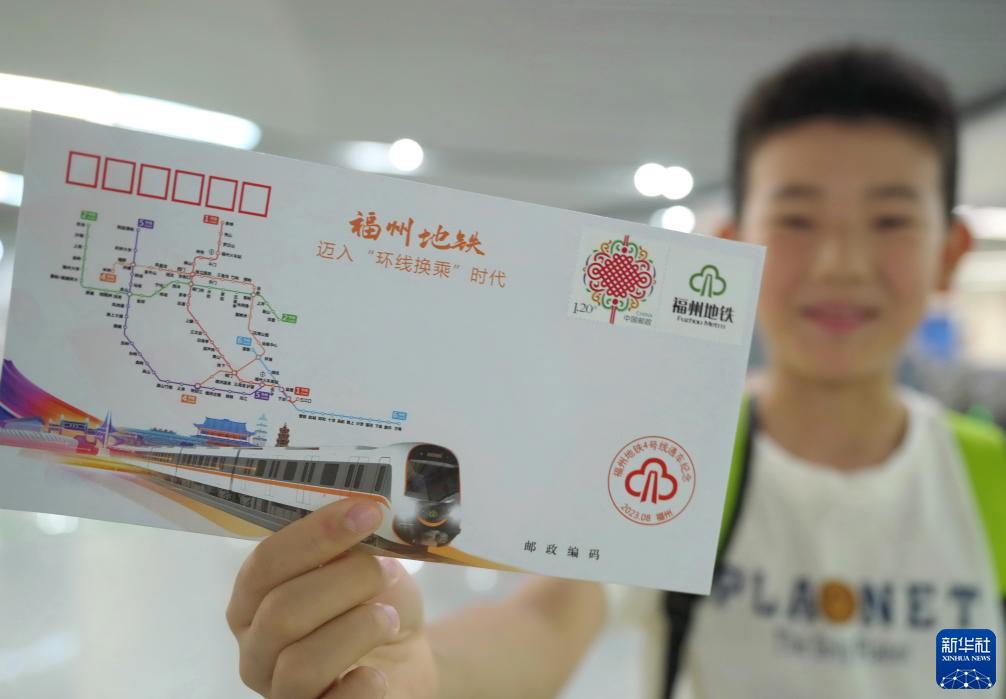 8月23日,一名小朋友在福州地鐵東街口站內展示福州地鐵4號線(xiàn)通車(chē)紀念首日封。