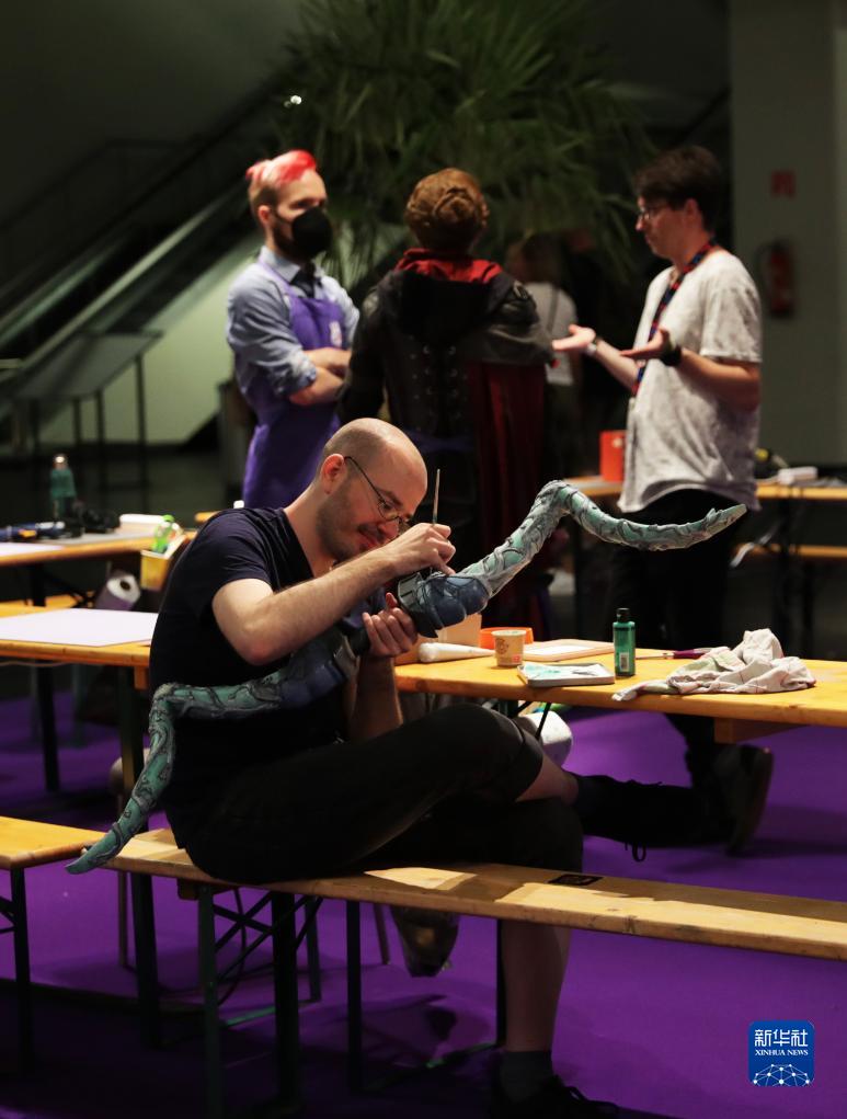 8月23日,參展商在德國科隆舉辦的科隆國際游戲展上制作道具。新華社記者 張帆 攝