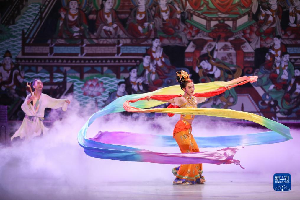 近日,中國經(jīng)典舞劇《絲路花雨》在甘肅省蘭州市的甘肅黃河劇院常態(tài)化駐場(chǎng)演出,甘肅省歌舞劇院的演員們演繹了優(yōu)美動(dòng)人的敦煌壁畫(huà)舞姿。