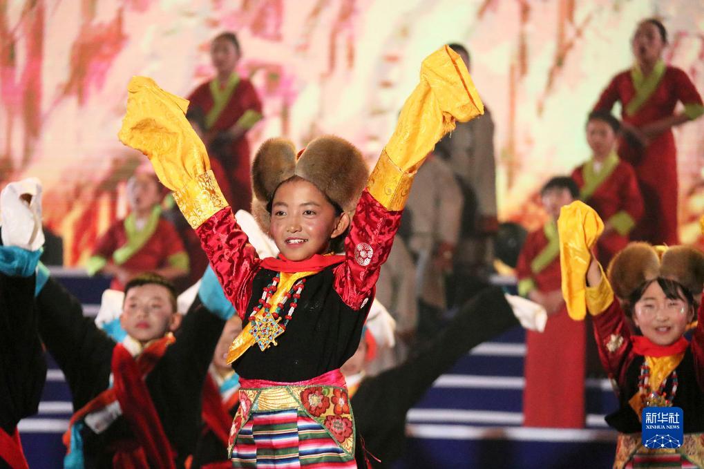 來(lái)自西藏山南市貢嘎縣的小學(xué)生在表演藏族傳統舞蹈(8月23日攝)。