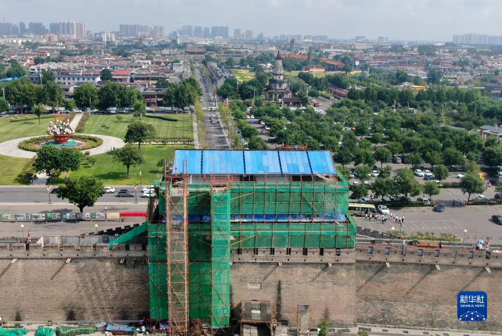 這是8月24日拍攝的正在修繕中的河北正定古城南城門(mén)樓(無(wú)人機照片)。