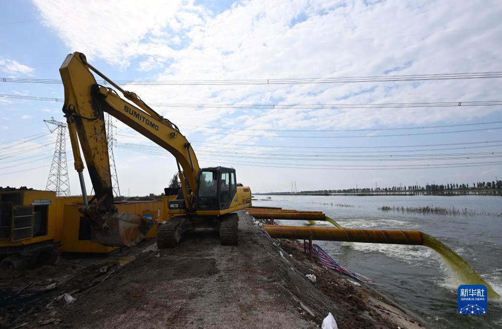 8月24日,一輛挖掘機在天津市靜海區大清河南堤抽水現場(chǎng)作業(yè)。