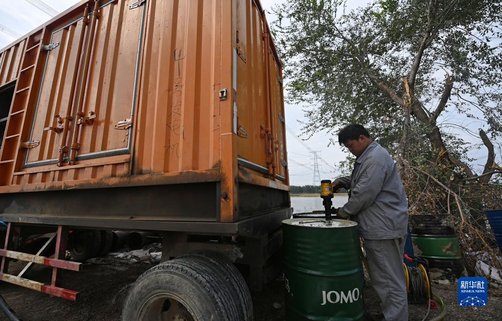 8月24日,工作人員在天津市靜海區大清河南堤抽水現場(chǎng)為移動(dòng)發(fā)電機加油。