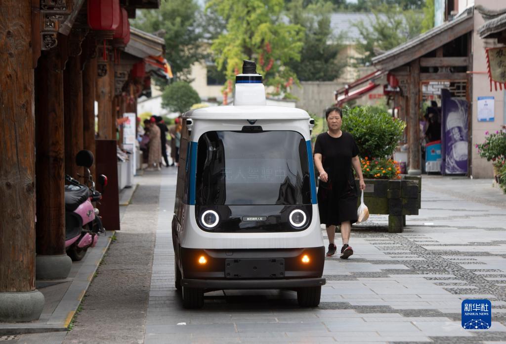 8月24日,在浙江省磐安縣尖山鎮烏石村,無(wú)人快遞車(chē)穿梭在山村街巷。