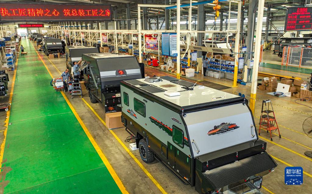 8月24日,山東省榮成市一家房車(chē)制造企業(yè)的工人在生產(chǎn)線(xiàn)上忙碌(無(wú)人機照片)。