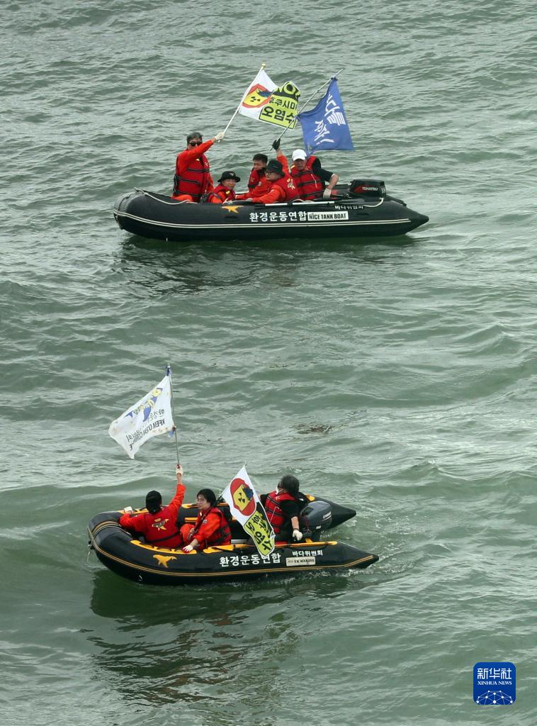 8月24日,韓國市民團體在釜山海云臺海域搭乘充氣艇,手揮標語(yǔ)抗議日本核污染水排海。