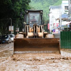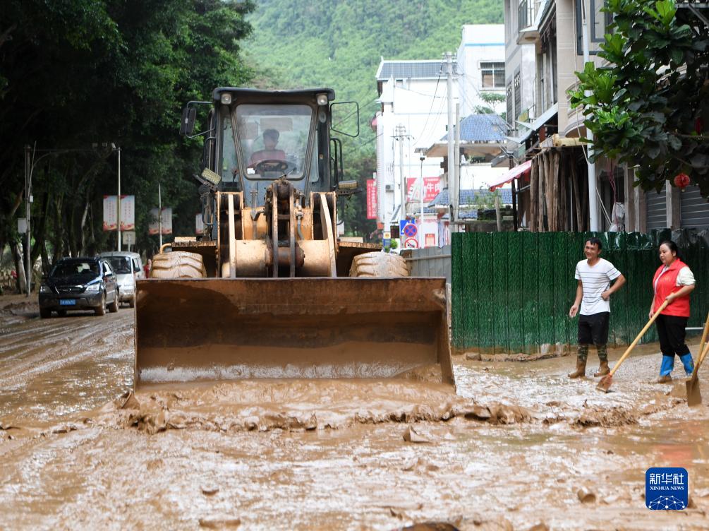 8月24日,在廣西百色市凌云縣下甲鎮,人們在清理道路上的淤泥。
