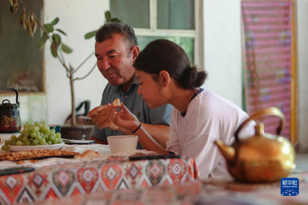 8月18日,爾肯·熱衣木(左)在家中和即將上初中的女兒喝茶聊天。
