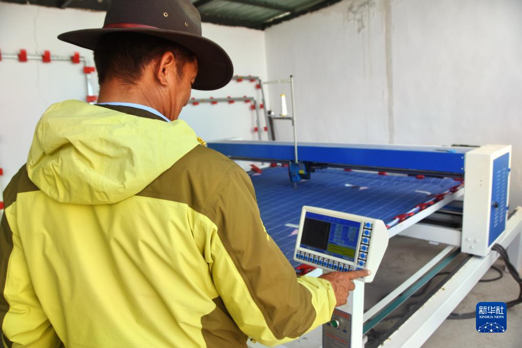 一位村民在操作羊毛被加工機器(8月24日攝)。