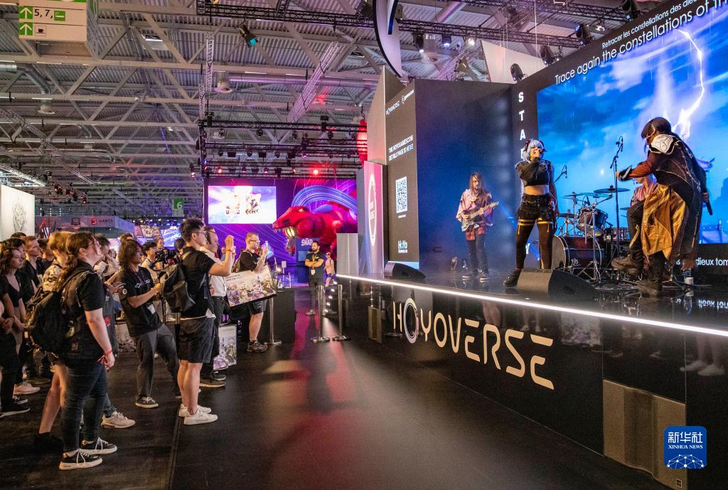 8月23日,在德國科隆游戲展上,人們在米哈游展臺觀(guān)看現場(chǎng)樂(lè )隊表演游戲歌曲。