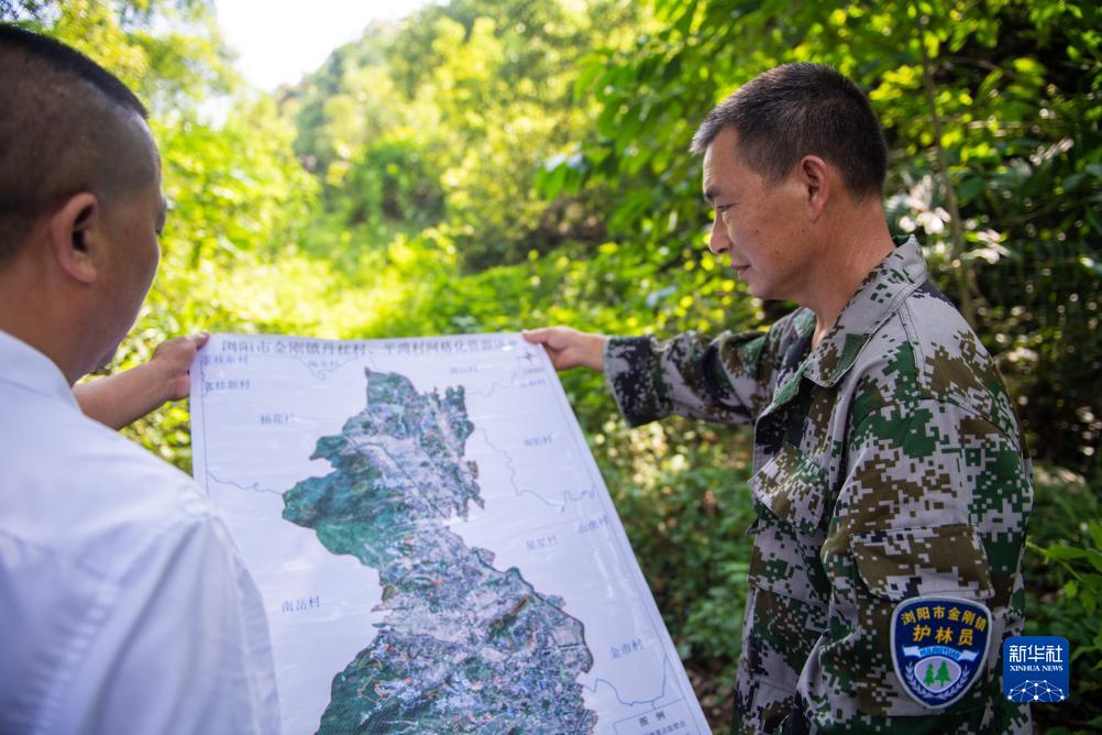 8月24日,在瀏陽(yáng)市金剛鎮平灣村,黃蔚谷(右)和村級林長(cháng)對照地圖確定古樹(shù)位置。