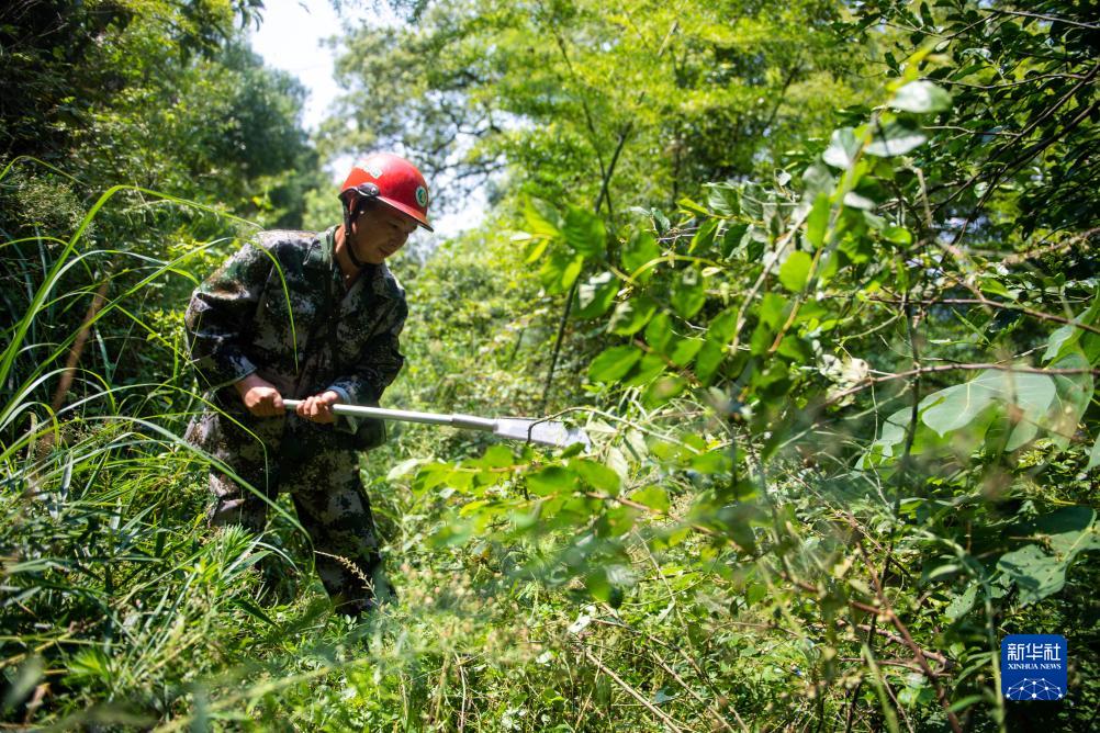 8月24日,在瀏陽(yáng)市金剛鎮平灣村,黃蔚谷清理巡山路上的雜草。