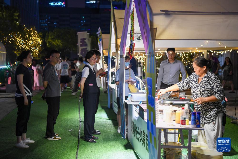 市民游客在南京市建鄴區西城·夜未央街區排隊購買(mǎi)小吃(8月25日攝)。
