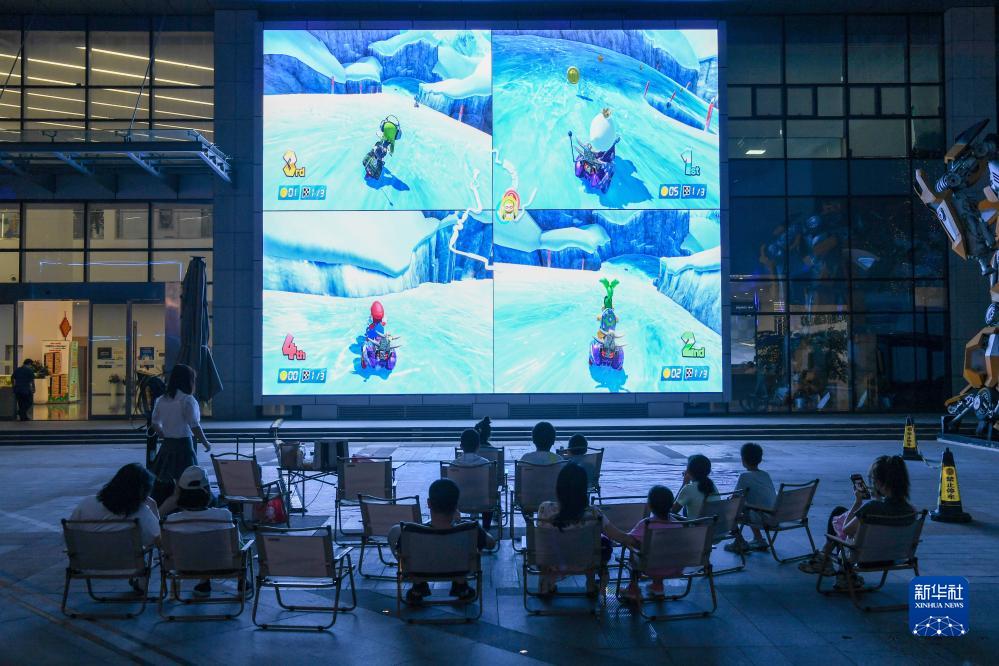 市民游客在南京市建鄴區西城·夜未央街區進(jìn)行電子游戲對戰(8月25日攝)。