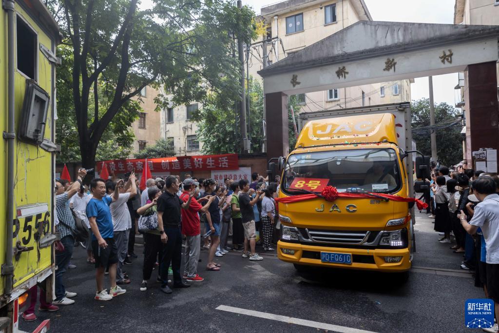 8月26日,居民簇擁在路邊為長(cháng)橋新村片區舊城區改建項目搬場(chǎng)居民送行。