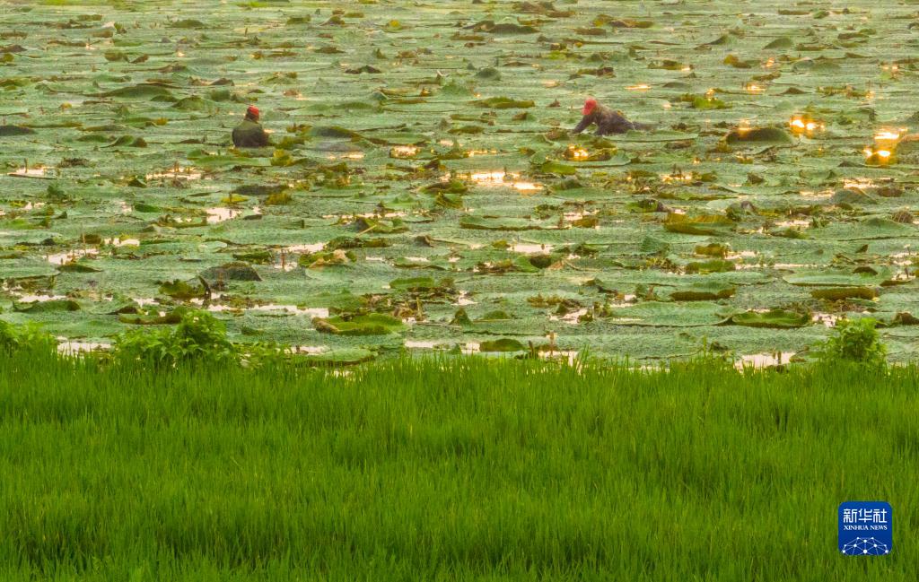8月26日,江蘇省泰州市姜堰區顧高鎮申俞村農民在采收芡實(shí)(無(wú)人機照片)。