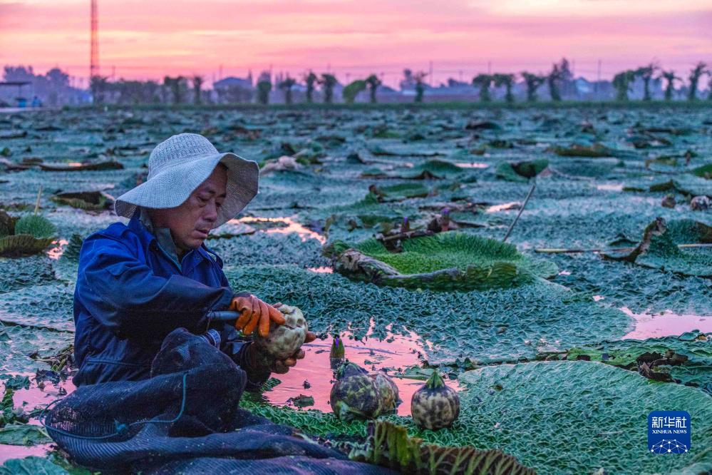 8月26日,江蘇省泰州市姜堰區顧高鎮申俞村農民在采收芡實(shí)。