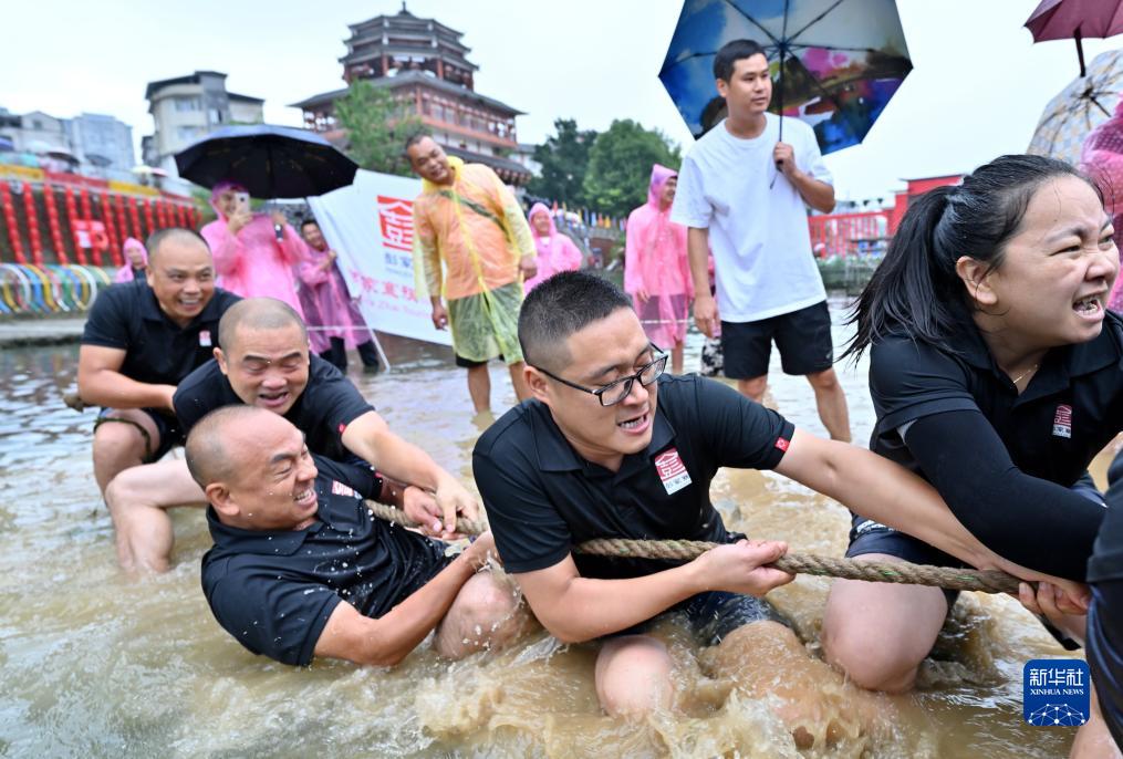 當日,在湖北省恩施土家族苗族自治州宣恩縣仙山貢水旅游區的貢水河中,近千名居民和游客組成60余支拔河隊在河中開(kāi)展趣味拔河比賽,感受快樂(lè )與清涼。