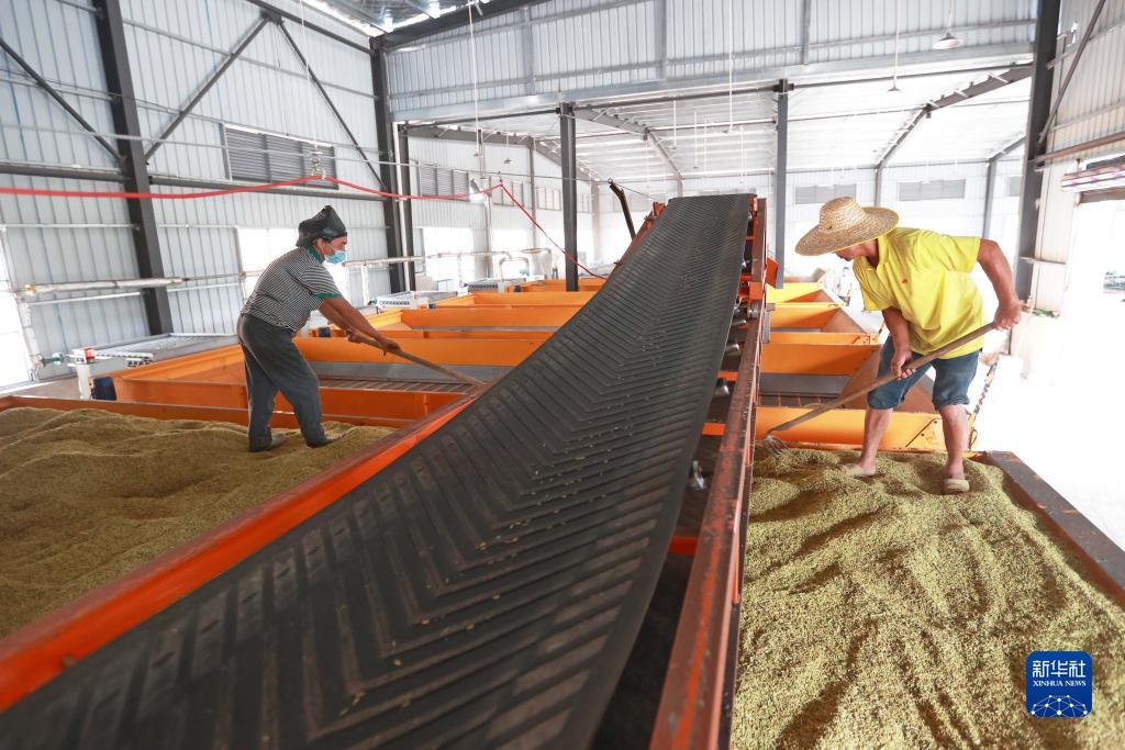 8月26日,村民在貴州省岑鞏縣羊橋土家族鄉龍灣村種子加工點(diǎn)烘烤水稻種子。