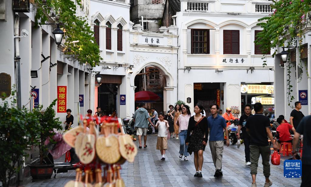 游客在??隍T樓老街參觀(guān)游玩(8月21日攝)。