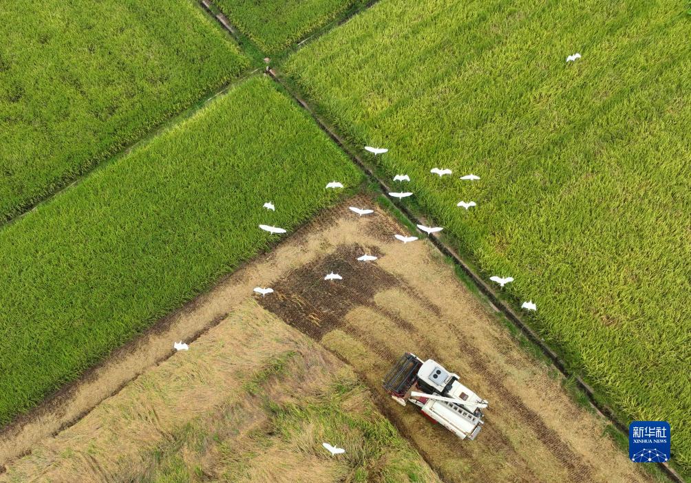 8月27日,在湖南省衡陽(yáng)市衡陽(yáng)縣臺源鎮,農機手駕駛收割機在收割稻谷(無(wú)人機照片)。
