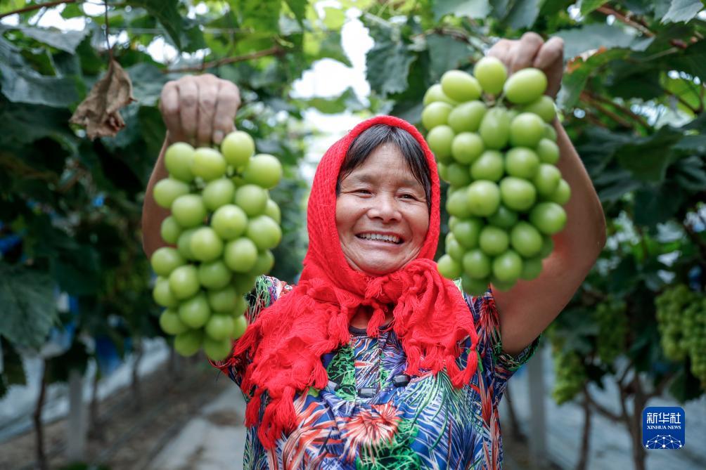 8月27日,農戶(hù)在江蘇省興化市林湖鄉鐵陸村生態(tài)葡萄園內展示采摘的葡萄。