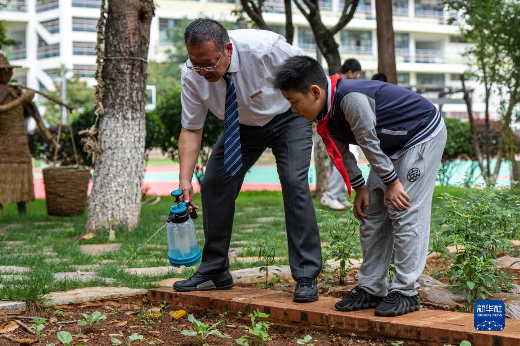 8月27日,云南省昆明市潤城學(xué)校的老師和學(xué)生在勞動(dòng)體驗實(shí)踐基地給菜地澆水。