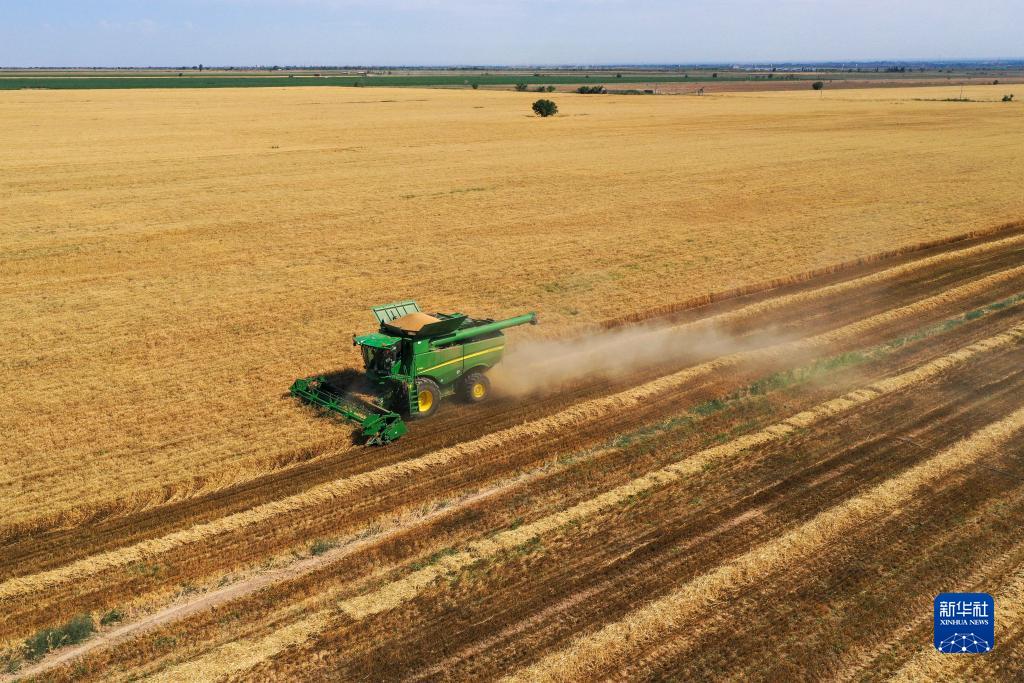 農機手在新疆呼圖壁縣二十里店鎮寧州戶(hù)村駕駛聯(lián)合收割機收割小麥(7月15日攝,無(wú)人機照片)。