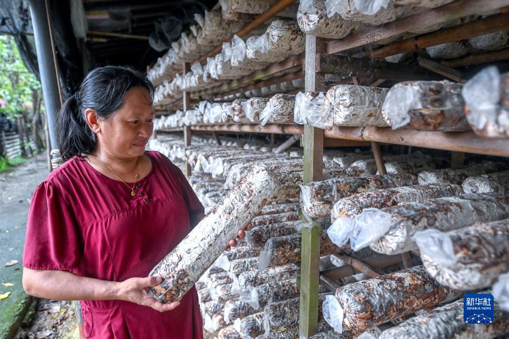 8月29日,種植戶(hù)陳金英在浙江省麗水市慶元縣濛洲街道冬瓜源食用菌基地查看菌棒上香菇的長(cháng)勢情況。陳金英家種植了三萬(wàn)根菌棒,年收入十多萬(wàn)元。