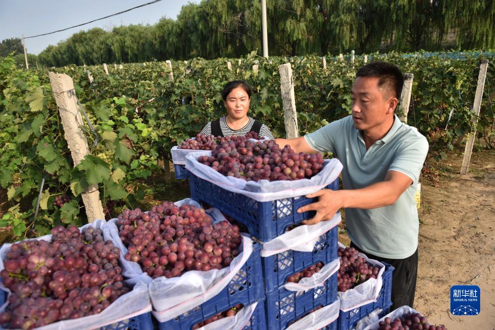 8月30日,邢臺市威縣戚霍寨村一家庭農場(chǎng)果農整理裝筐的葡萄。