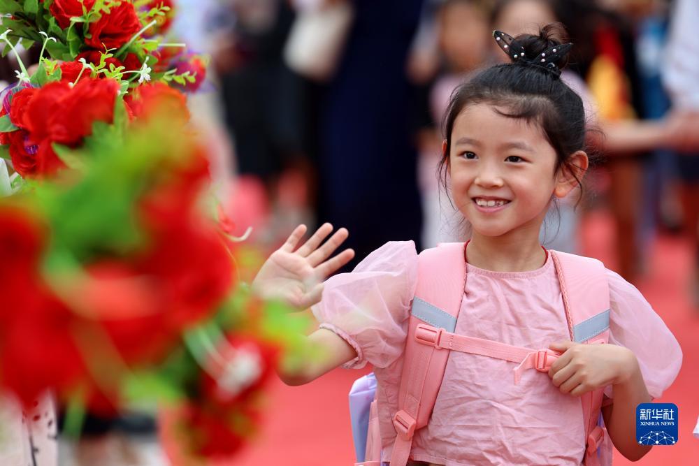 8月30日,在山東省棗莊市市中區東湖小學(xué),一名一年級新生向迎接他們的老師揮手致意。