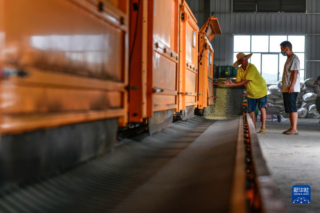 陳良東(左)在種子加工車(chē)間查看今年收獲的稻種烘干情況(8月26日攝)。