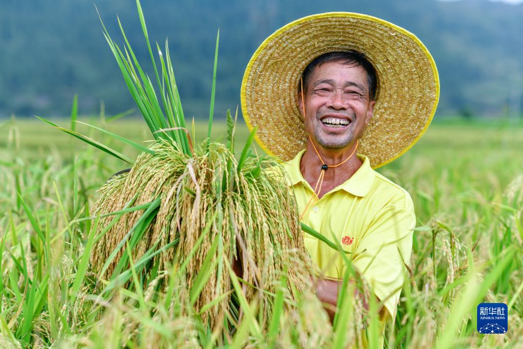 陳良東在水稻制種基地展示收獲的水稻種子(8月26日攝)。