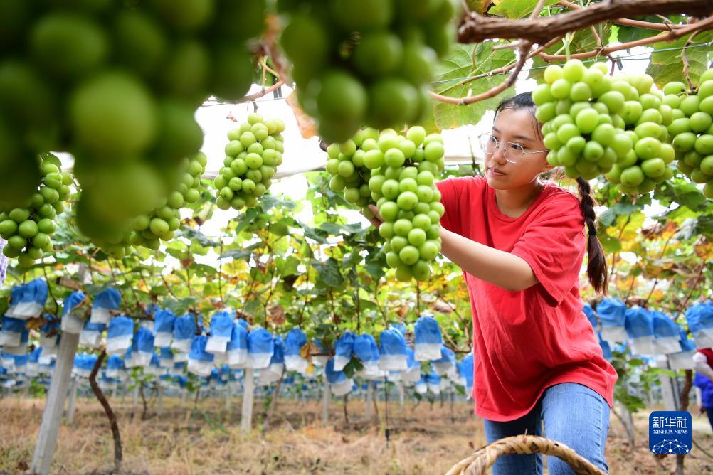 8月30日,潘雅潔在肥西縣紫蓬鎮的葡萄園里采摘葡萄。