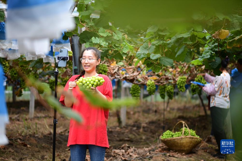 8月30日,潘雅潔(左一)在肥西縣紫蓬鎮的葡萄園里直播。