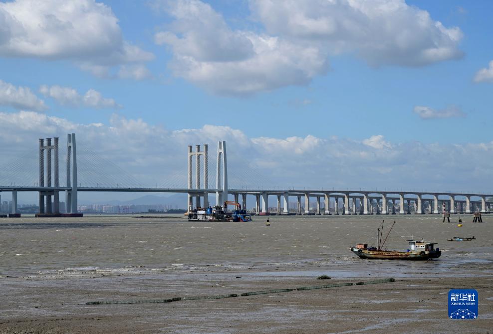 8月30日,在福建泉州灣跨海大橋附近海域,海上作業(yè)施工船停工,漁船靠岸停泊。