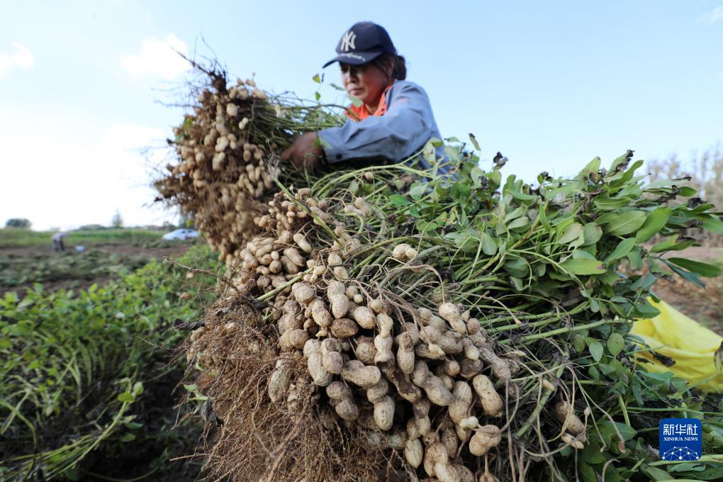 8月30日,山東省臨沂市郯城縣郯城街道山南頭村村民整理收獲的花生。