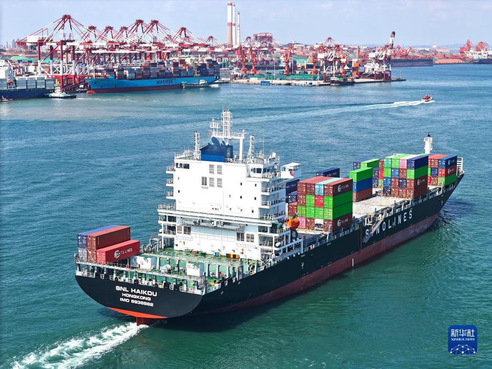 8月30日,“中外運??凇陛喚従忨傠x山東港口青島港(無(wú)人機照片)。