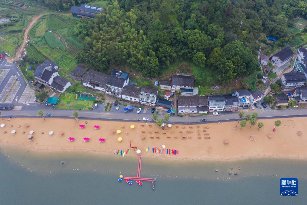 8月30日拍攝的長(cháng)汀村的長(cháng)汀沙灘景區(無(wú)人機照片)。云和縣石塘鎮長(cháng)汀村位于浙江省第三大人工湖——云和湖畔、“十里云河”美麗鄉村風(fēng)景線(xiàn)的中心路段。