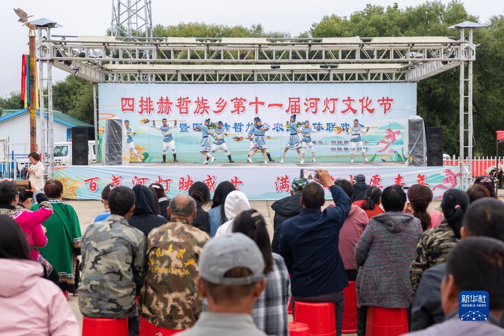 8月30日,在黑龍江省饒河縣四排赫哲族鄉,當地居民觀(guān)看河燈文化節的表演。