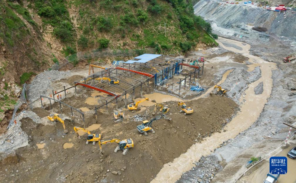 8月30日,救援人員在位于金陽(yáng)縣境內蘆稿林河下游的蜀道集團沿江高速JN1(金寧一)標段項目部鋼筋加工場(chǎng)民工駐地附近實(shí)施救援(無(wú)人機照片)。