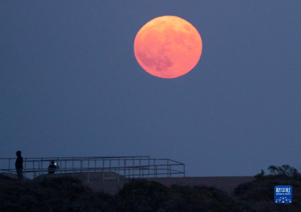 這是8月30日在美國舊金山金門(mén)大橋附近拍攝的“超級月亮”。
